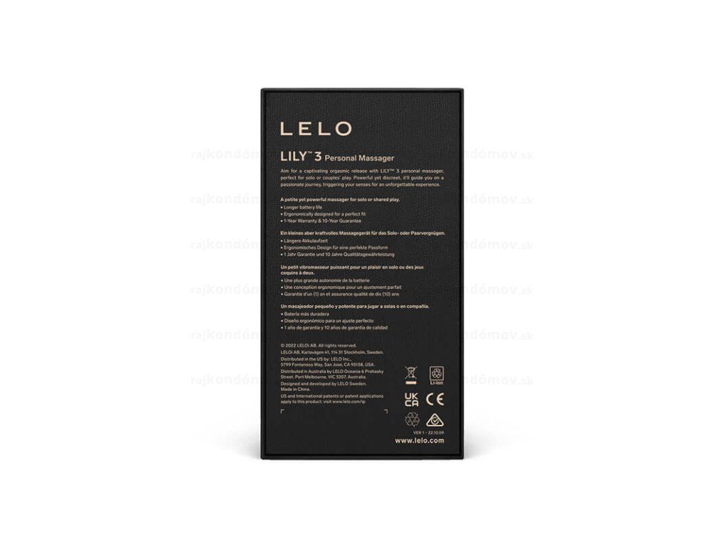 LELO Lily 3 je malý cestovný vibrátor pre ženu. Lily 3 je určený na stimuláciu klitorisu prostrednístvom intenzívnych vibrácií. Vibračné režimy a intenzity jednotlivých režimov nastavujete na hračke, pomocou dvoch tlačidiel. Vibrátor je usb nabíjateľný a plne vodeodolný (IPX7).