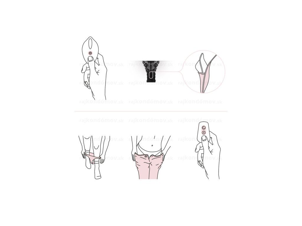 Ovládanie: Vibrátor zapnete krátkym stlačením tlačidla zapnutia/vypnutia, hneď po zapnutí pocítite, ako vibruje. Tlačidlom s kruhom na diaľkovom ovládači je možné zmeniť nastavenia vibrácií a vibrácie pozastaviť tlačidlom pauzy.